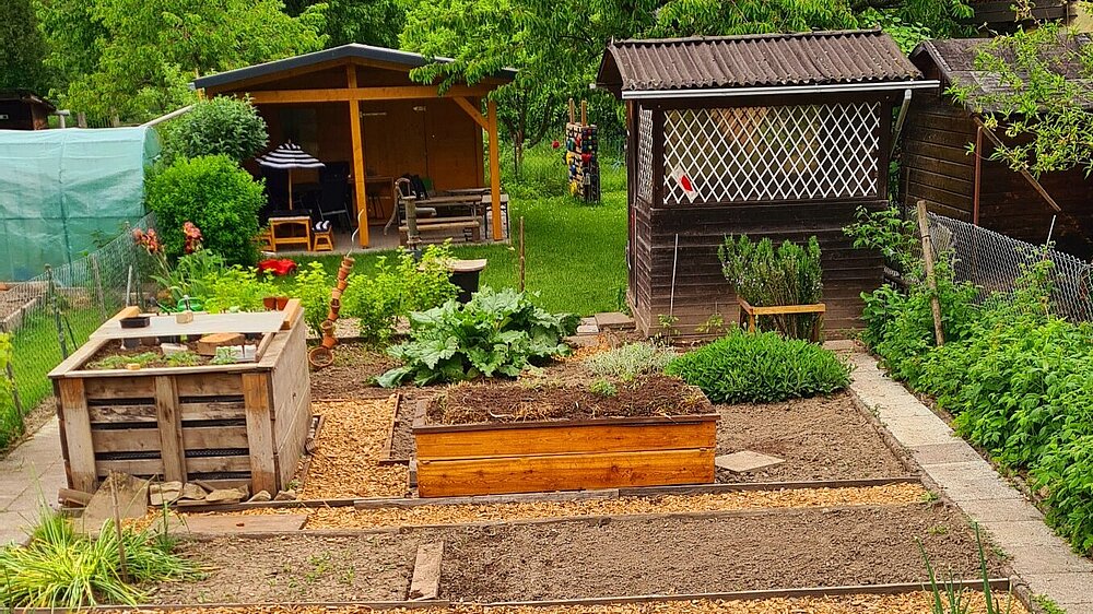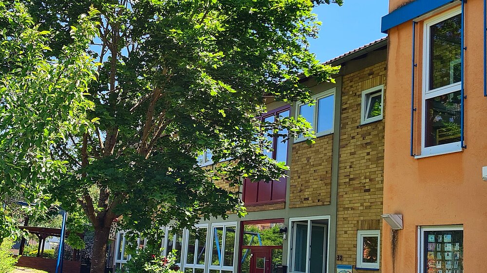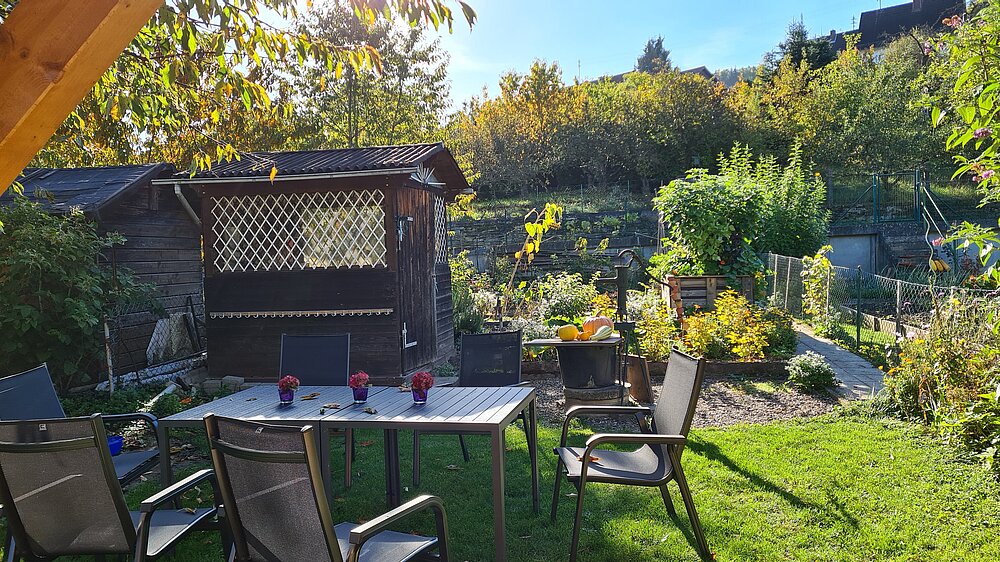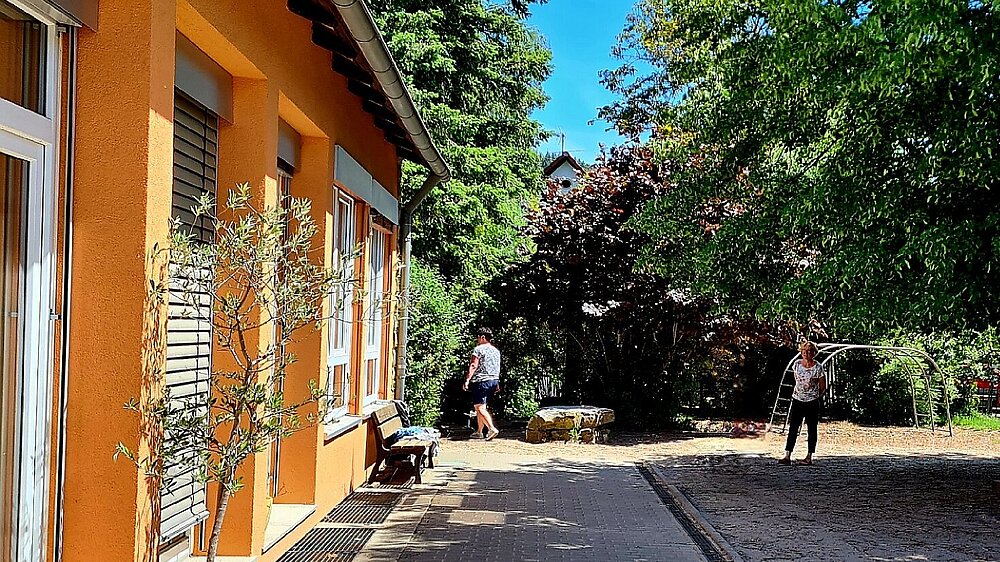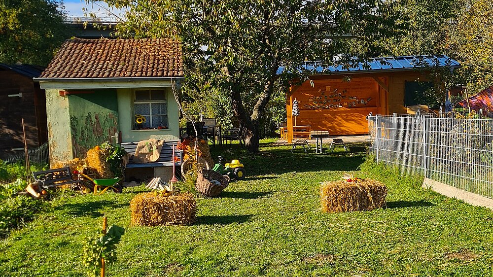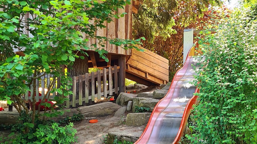 Außerdem verfügt unsere Einrichtung über ein großzügiges naturnah gestaltetes Außengelände mit Rutsche, Klettergerüsten, Sandkasten, Bachlauf, Baumhaus, Seilbahn und noch vielem mehr. Seit 2018 besitzt die KITA einen kleinen Nutzgarten, der nur ein paar Schritte entfernt ist. Durch den Bau eines Pavillons besteht auch für Familien die Möglichkeit den „Garten der Begegnung“ mitzubenutzen.