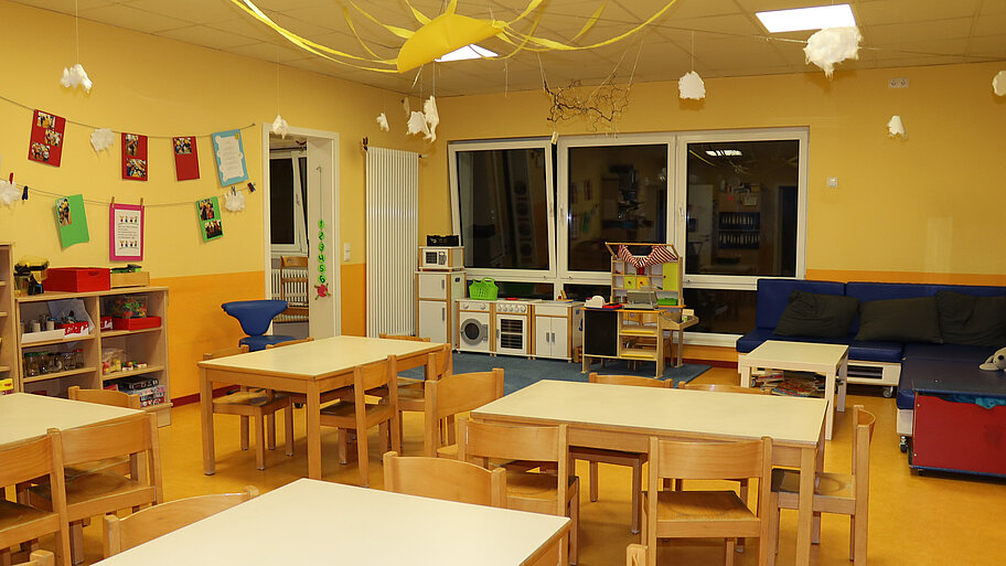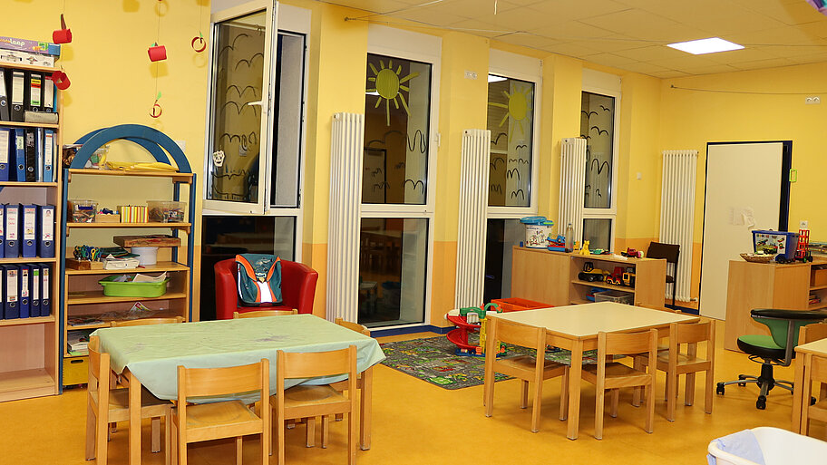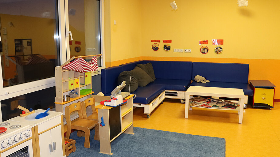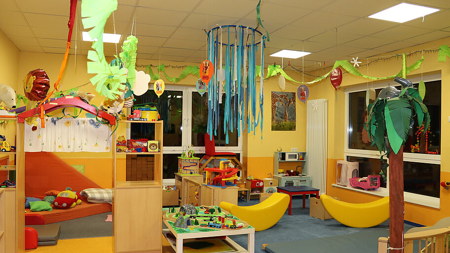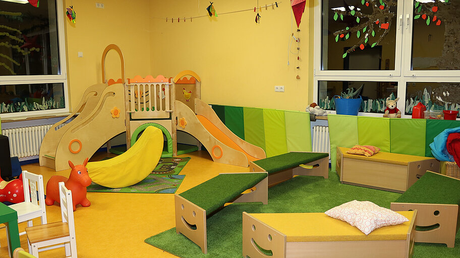 Die jüngeren Kinder haben ihren Platz in der grünen Gruppe. In diesem Raum sind feste Erzieherinnen zuständig für 13 Kinder im Alter von 1 - 3 Jahren. Der Raum ist nach den Bedürfnissen von jüngeren Kindern eingerichtet.